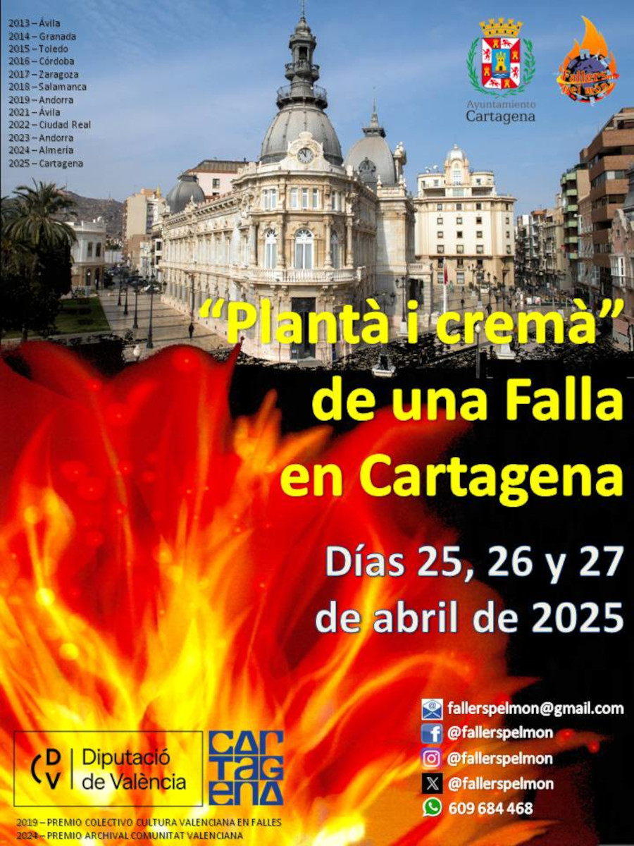 Alrededor de 4.000 mil falleros visitarán Cartagena gracias al impulso del Ayuntamiento, la Diputación de Valencia y Fallers pel món. Esta asociación organiza cada año esta fiesta popular valenciana en un lugar distinto, siendo Cartagena la ciudad elegida este 2025. En el puerto, junto a Héroes de Cavite, se instalará un recinto ferial y carpa, con acceso libre para todos los habitantes de Cartagena (será necesario presentar DNI). La afluencia de estos turistas llenará los hoteles de la ciudad y varios de La Manga del Mar Menor.