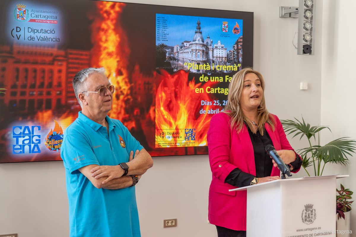 Beatriz Sánchez, edil delegada de Turismo, junto al presidente de Fallers pel món, José Amores han presentado la programación de esta fiesta que gira en torno a la plantá y cremá de una falla, que ya está instalada en el puerto. Pero también da cabida a las fiestas valencianas de Moros y Cristianos, así como a las fiestas históricas de Cartagena, los Carthagineses y Romanos. Juntos desfilarán por las calles de la ciudad.