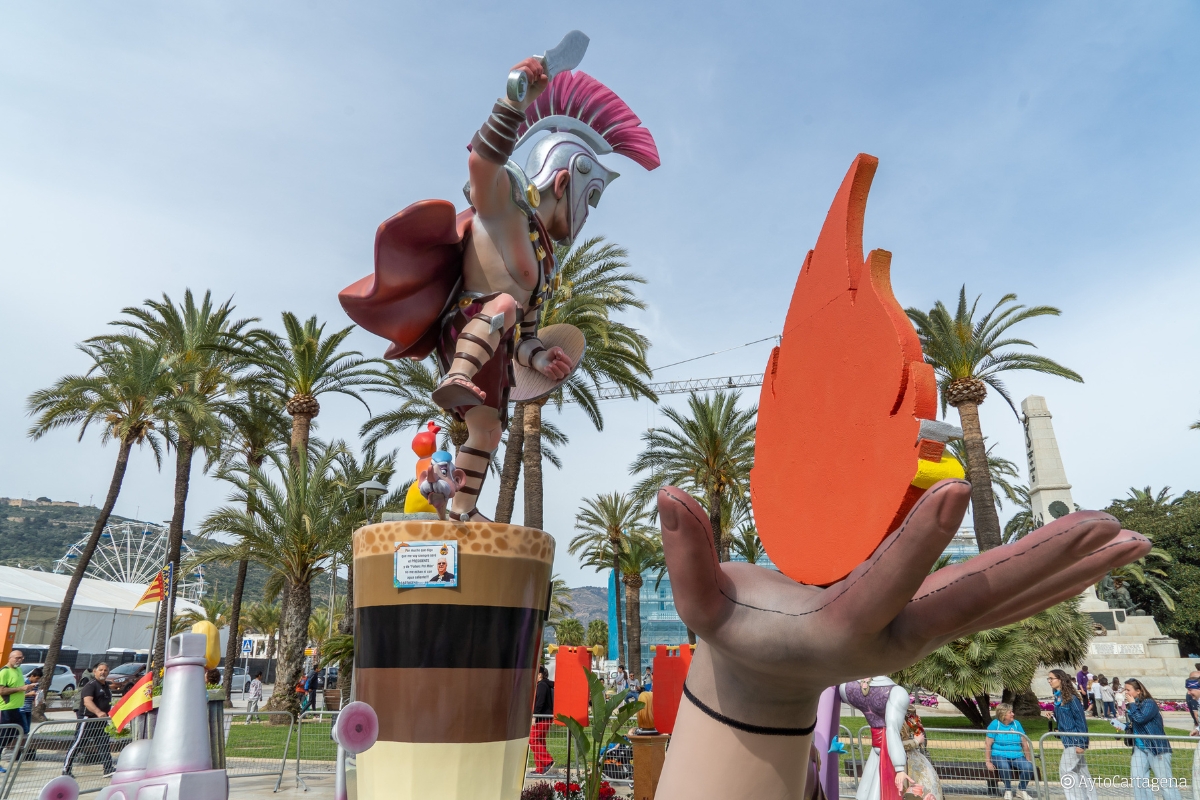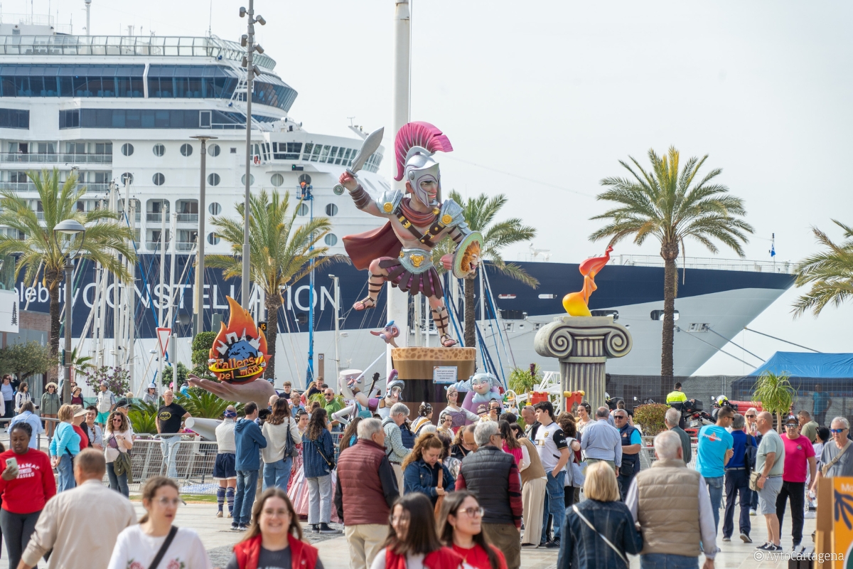 Una falla coronada por un guerrero carthaginés sobre un café Asiático se puede ver hasta el domingo 27 de abril en el puerto de Cartagena. La escultura es uno de los grandes atractivos de las fallas de Valencia que se celebran este fin de semana en Cartagena y supondrán el desembarco de alrededor de 5.000 festeros falleros en la ciudad. A ellos se sumarán Moros y Cristianos, así como tropas y legiones de las fiestas históricas locales de Carthagineses y Romanos. Una afluencia que repercute positivamente en la ciudad, llenando los hoteles del casco urbano y varios de La Manga del Mar Menor.