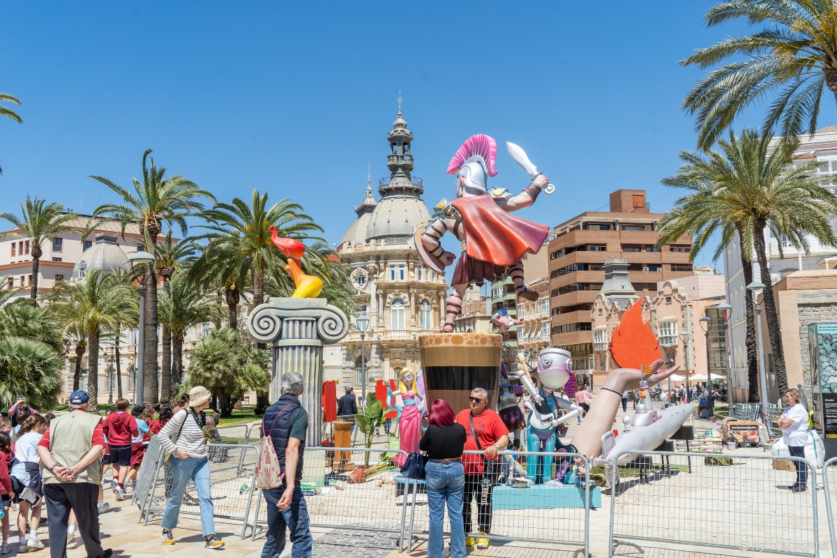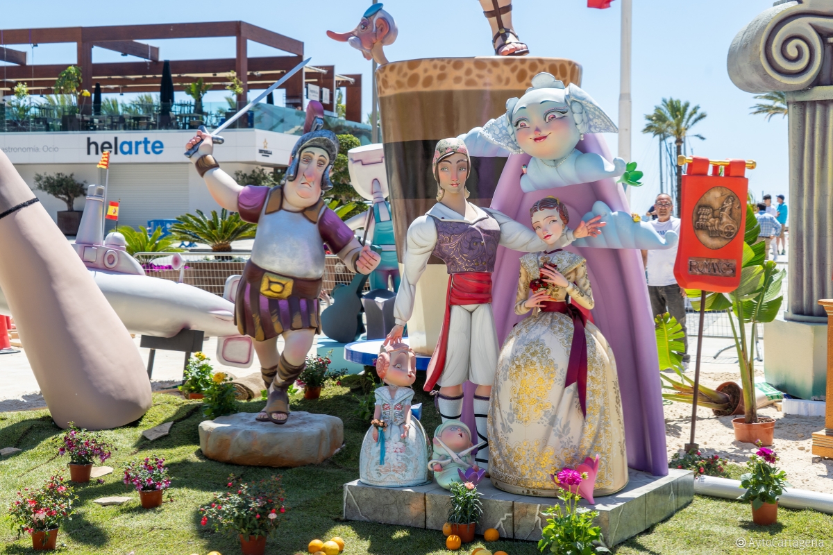 Una falla coronada por un guerrero carthaginés sobre un café Asiático se puede ver hasta el domingo 27 de abril en el puerto de Cartagena. La escultura es uno de los grandes atractivos de las fallas de Valencia que se celebran este fin de semana en Cartagena y supondrán el desembarco de alrededor de 5.000 festeros falleros en la ciudad. A ellos se sumarán Moros y Cristianos, así como tropas y legiones de las fiestas históricas locales de Carthagineses y Romanos. Una afluencia que repercute positivamente en la ciudad, llenando los hoteles del casco urbano y varios de La Manga del Mar Menor.