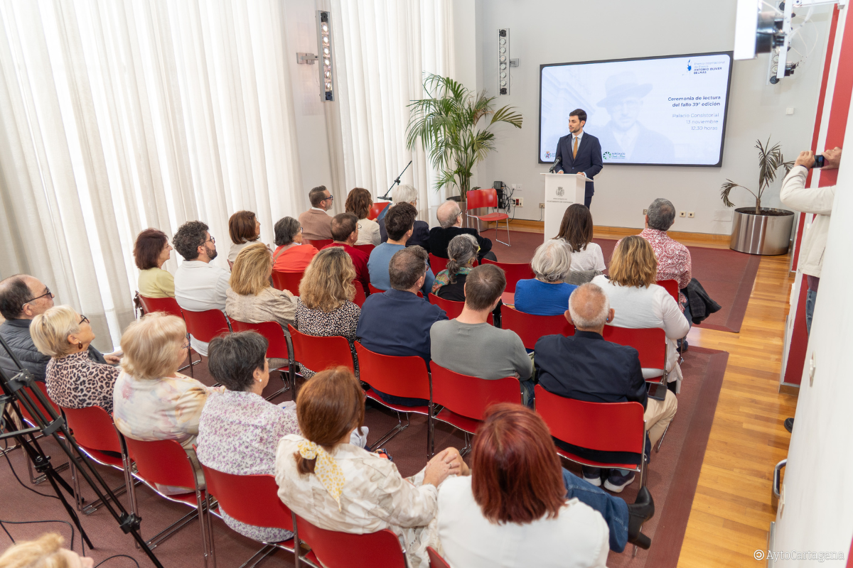 Con motivo del fallo del Premio Internacional de Poesía Antonio Oliver, este miércoles 12 de noviembre, el Palacio Consistorial ha acogido un homenaje al poeta. En el mismo, Francisco Javier Díez de Revenga, catedrático emérito de Literatura Española en la Universidad de Murcia y cronista Oficial de la Ciudad de Murcia, realizó un recorrido por la vida y obra del artista. Esta charla estuvo presentada por Fran Garcerá, técnico del Patronato Carmen Conde-Antonio Oliver.