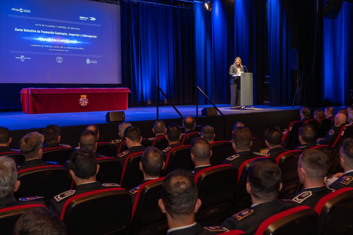 Cartagena ha reafirmado hoy su papel como referente en la formación de seguridad pública con la celebración del acto de clausura y entrega de diplomas del curso selectivo de formación para policías en las categorías de Comisario, Inspector y Subinspector de los cuerpos de Policía Local de la Región de Murcia. El evento se ha celebrado este martes 10 de marzo en el Centro Cultural Ramón Alonso Luzzy, bajo la presidencia de la alcaldesa de Cartagena, Noelia Arroyo, y el consejero de Economía, Hacienda y Fondos Europeos, Luis Alberto Marín.