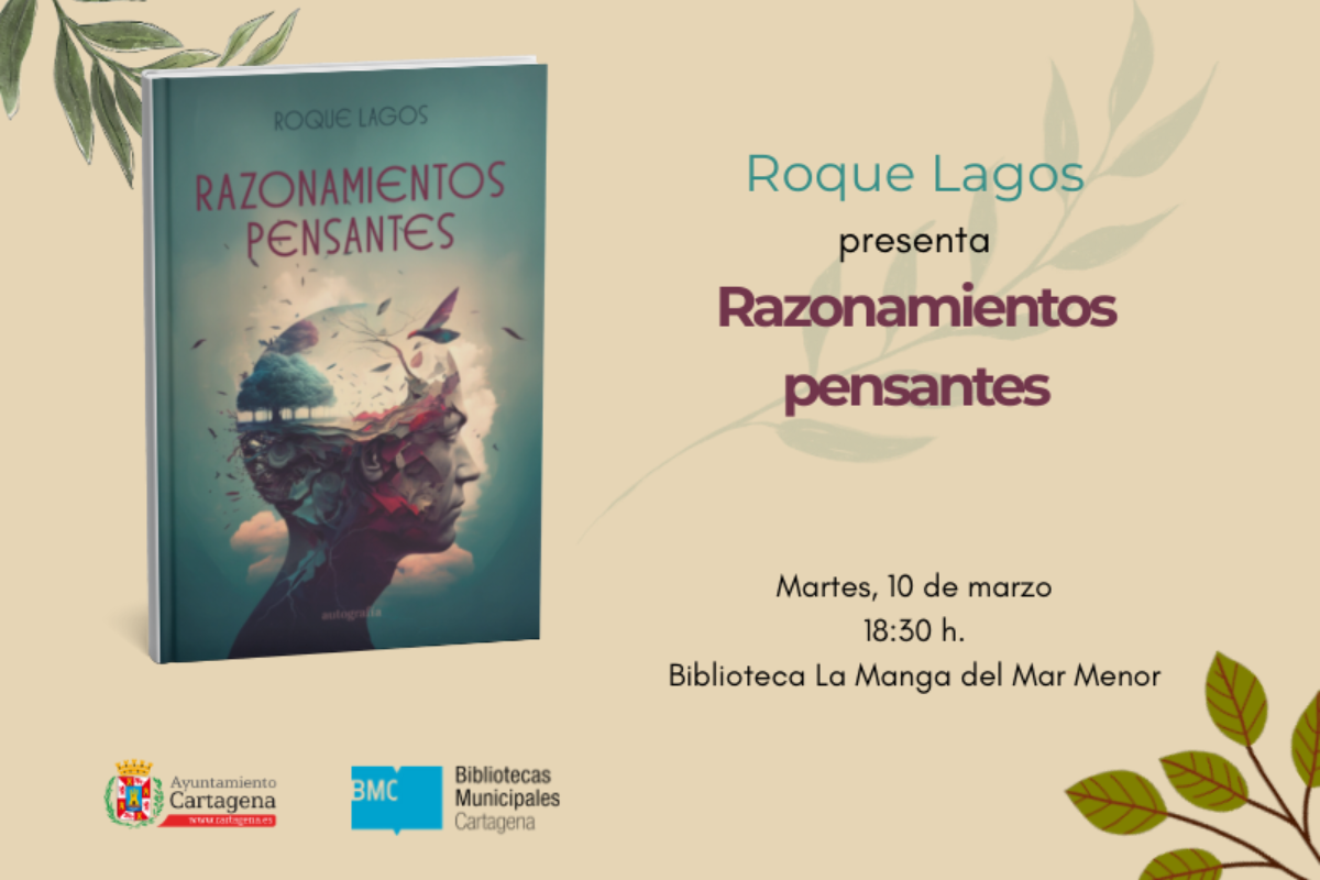 La programación literaria del Ayuntamiento de Cartagena recibe este martes 10 de marzo, a las 18:30 horas, al autor Roque Lagos, quien presentará su obra Pensamientos Pensantes. El acto se realizará en la biblioteca de La Manga del Mar Menor y la entrada es libre, hasta completar aforo.