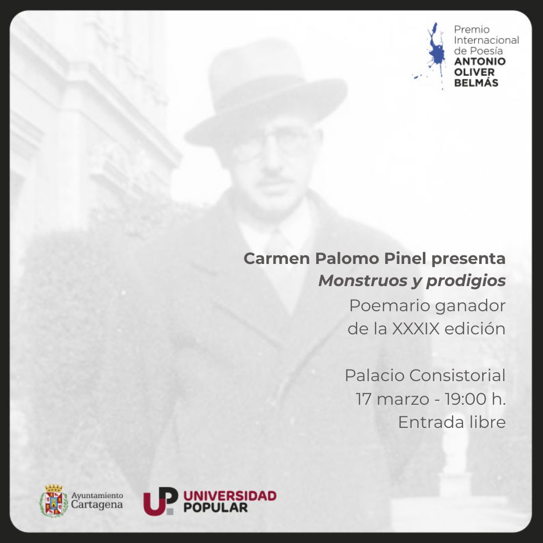 La escritora Carmen Palomo Pinel presentará el próximo martes 17 de marzo, a las 19:00 horas, en el Palacio Consistorial de Cartagena, Monstruos y Prodigios, la obra ganadora del XXXIX Premio Internacional de Poesía Antonio Oliver Belmás, organizado por el Ayuntamiento a través de la Universidad Popular. El acto se desarrollará en la sala de ceremonias y estará conducido por Laura Piñero García, periodista especializada en periodismo social y cultural. La entrada es libre, hasta completar aforo.