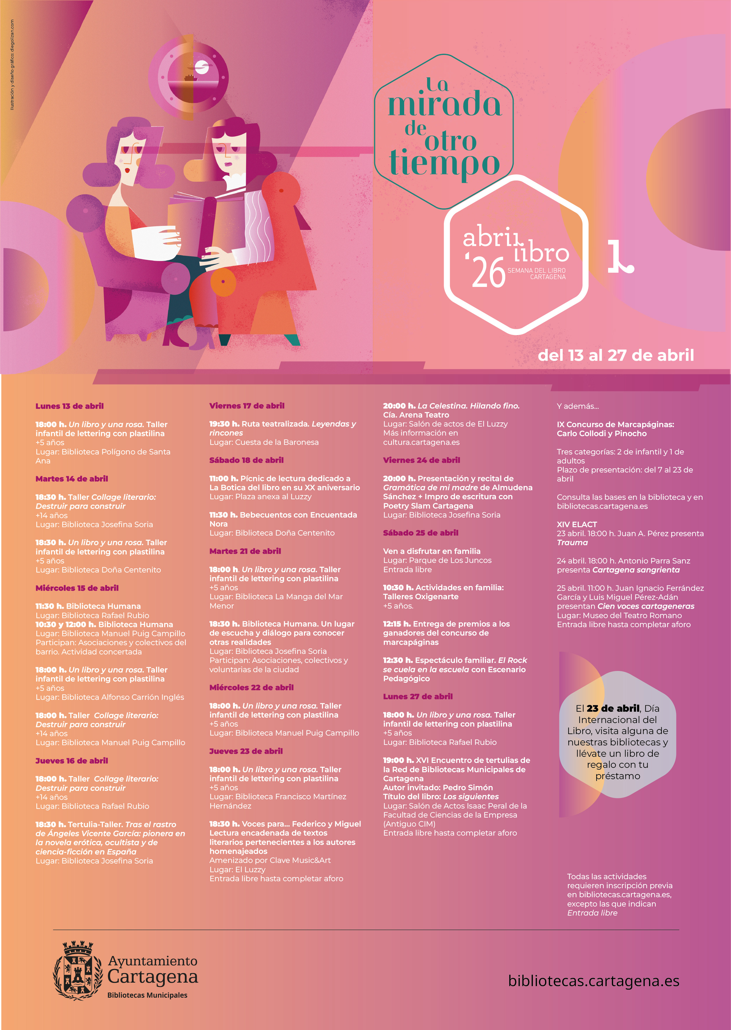 Literatura. Pícnic literario, a las 11:00 horas, en la plaza anexa al Centro Cultural Ramón Alonso Luzzy. En dedicatoria a los veinte años de vida del proyecto de integración a través de la lectura “La Botica del Libro” y con motivo de AbrirLibro ‘26 organizamos este Picnic de lectura: Una experiencia inspirada en las populares fiestas de lectura surgidas en Estados Unidos en 2023, que convertirá esta zona en un espacio para desconectar y disfrutar de la lectura al aire libre. Entrada libre, previa inscripción en www.bibliotecas.cartagena.es